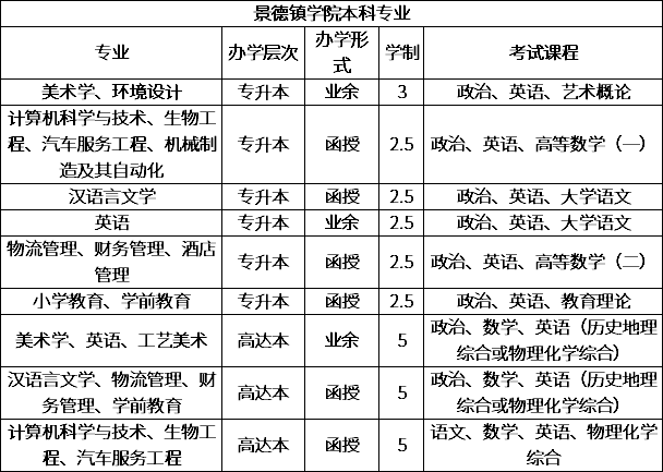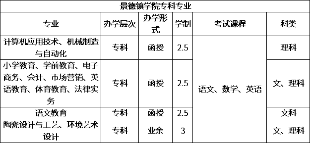 景德镇学院是一所公办多科性全日制普通本科院校,坐落在全国历史文化名城、中国优秀旅游城市、世界闻名的千年瓷都——江西省景德镇市。学校主动适应地方经济社会发展需要,打造优势特色专业,对接景德镇“汽车、航空、陶瓷、旅游”、“3+1+X”特色优势产业链,构建了以教师教育为基础,以陶瓷艺术为特色,多学科协调发展的专业体系,成为景德镇及周边地区重要的人才培养基地。2020年我院面向社会各界招收成人教育本专科学生,凡报考我院第一志愿,且上了录取分数线者均可录取。欢迎广大考生踊跃报考我院!