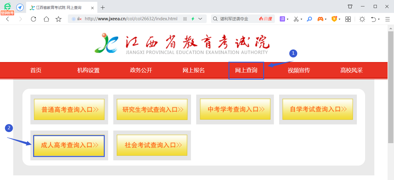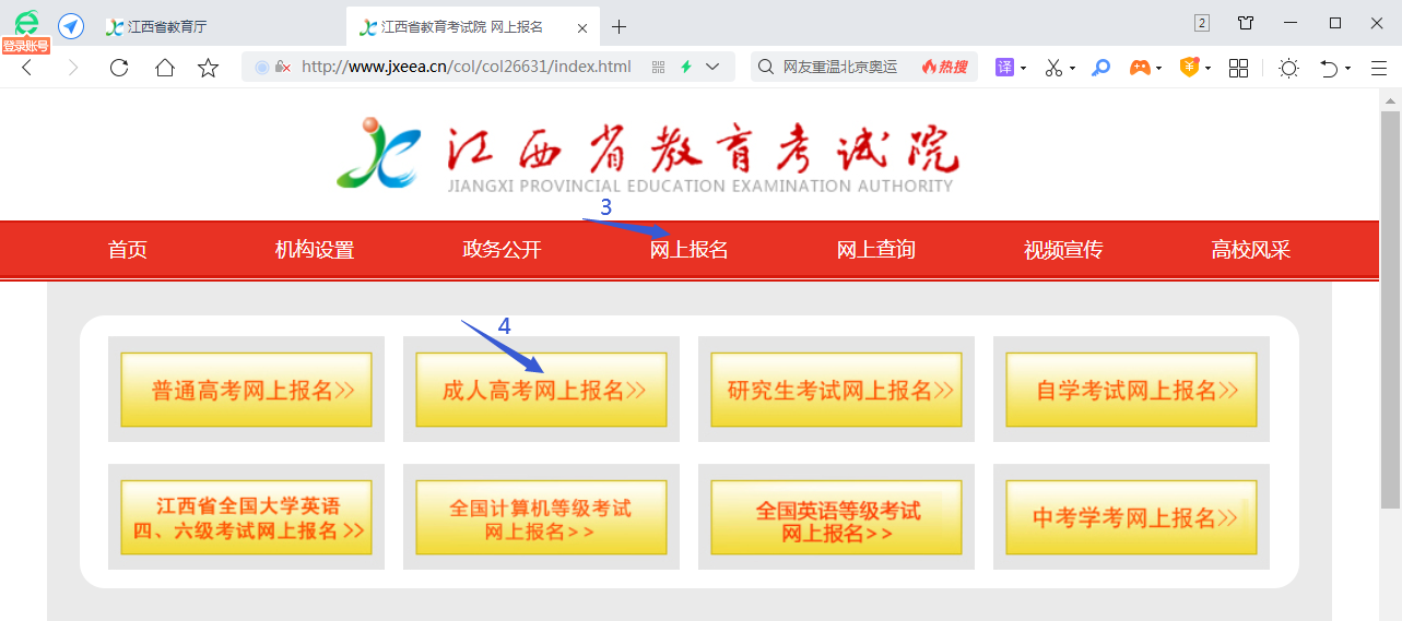 1.考生凭县(区)招生考试机构打印的报名序号和自己设置的密码登录江西省教育考试院官网的“江西省成人高考网上报名系统”。
