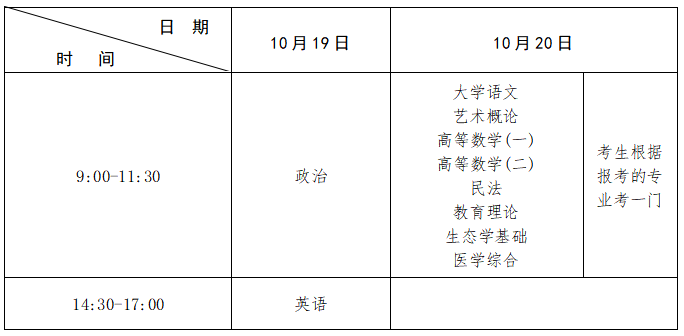 (二)专科起点升本科考试统考科目均为三门。其中两门公共课为政治、英语,一门专业基础课根据招生专业所隶属的学科门类确定(具体考试科目见附件3)。